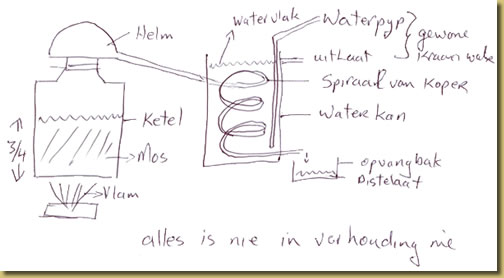 Die punt van die helm is verbind aan ’n koper spiraal (slang). Die slang is ’n lang metaalpyp, wat soos die kronkelveer van ’n motor se veringstelsel, in ’n drom (afkoelvat) afgaan waarin daar voortdurend koue lopende water sirkuleer. Die mos kook vir sowat drie tot vier ure in die ketel. Damp in die vorm van stoom vergader dan in die helm en slang, waar kondensasie plaasvind en loop dan af na die opvangemmer. Al die vloeistof (alkohol wat uit die mos kondenseer) word in ’n emmer, waaroor n doek gespan is, opgevang.
